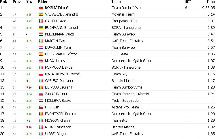 Martin, llegaría a 12 segundos, tras el que habría un hueco de 33 segundos con Formolo y Zakarin y a 36, Knox, Mollema, Hirt, De la Parte o Kelderman. A 42 llegaría Dumoulin, con Kiatkowski e Izagirre a 56, y más de 1 minuto para Nibali (Porte perdería hasta 7 minutos).